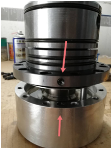 4. 用氣(qì)槍向圖中(zhong)密封圈處(chù)吹起,頂起(qi)活塞杆,分(fen)離缸體。