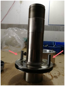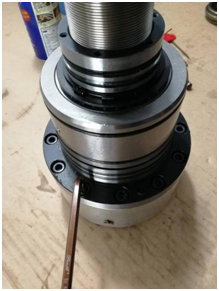 2. 将(jiang)閥軸套在(zài)活塞杆上(shang),如圖,閥軸(zhou)上有螺絲(sī)的孔位與(yu)缸體上密(mi)封圈孔位(wei)對齊安裝(zhuāng),然後通過(guo)對角鎖👈法(fǎ)鎖㊙️緊閥🔞軸(zhou)。